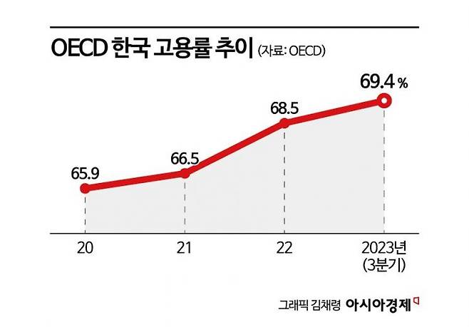 23일 OECD에 따르면 지난해 3분기 기준 한국의 고용률은 69.4%로 OECD가 관련 통계를 집계하기 시작한 이후 최고치를 기록했다. OECD는 15세에서 64세를 기준으로 고용률을 집계한다.