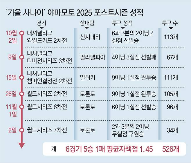 월드시리즈 6, 7차전에서 연속 승리를 차지한 투수가 나온 건 2001년 랜디 존슨(62·당시 애리조나) 이후 24년 만이다. 야마모토는 올해 2차전에서도 9이닝 1실점 완투승 따내 이번 월드시리즈에서 3승을 거뒀다. 같은 해 월드시리즈에서 3승을 거둔 것 역시 2001년 존슨 이후 24년 만이다. 월드시리즈 3승을 전부 방문경기에서 따낸 건 야마모토가 처음이다.