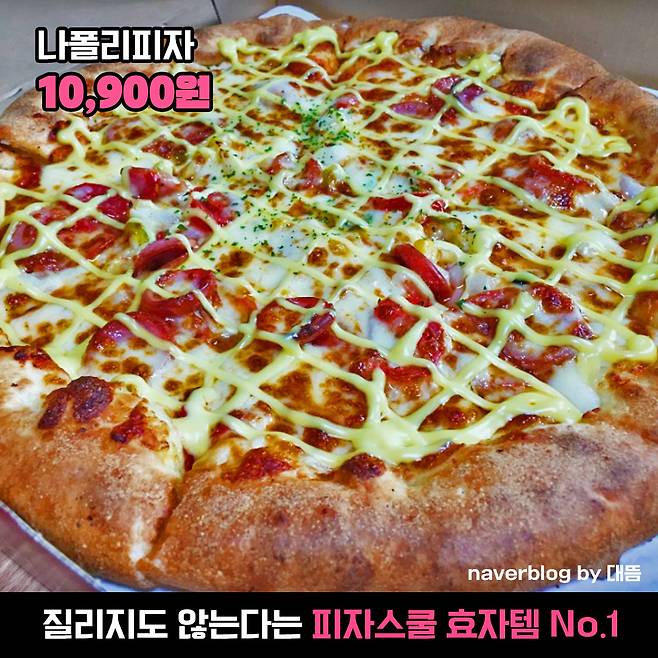 고구마피자의 절대 강적, 나폴리 피자 등장! 피자스쿨하면 나폴리 피자 떠올리시는 분들이 정말 많을 정도로 효자메뉴죠? 주요 토핑은 미니카나디안과 방울토마토, 페퍼로니예요. 골드마요소스까지 듬뿍~