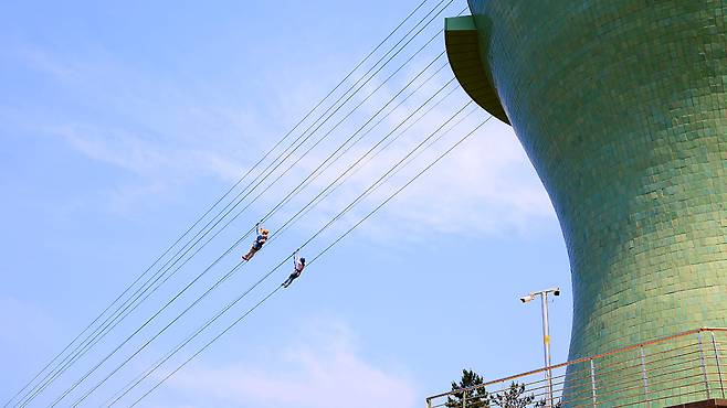 가우도의 정상에는 높이 25m의 청자타워가 우뚝 서 있다. 이곳에서 시작하는 집트렉(ziptrek)은 바다 위를 날아오르는 듯한 짜릿함을 선사하며, 여름 여행의 하이라이트로 손꼽힌다.