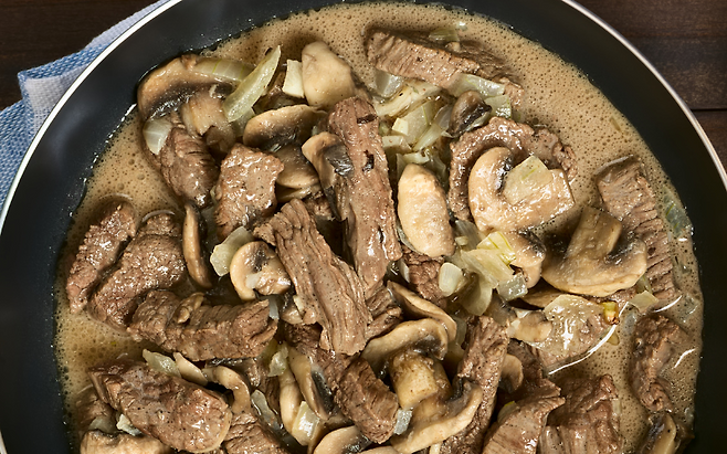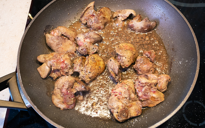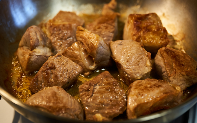 기름 대신 물이나 채소 육수를 소량 넣어 구우면, 고기가 팬에 달라붙지 않고 부드럽게 익습니다.