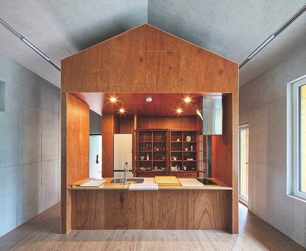 두 번째로 실내 구성과 관련해 순환하는 집의 개념을 구현하고자 했다. 박공 형태의 집안에서 모든 실과 공간은 자연스럽게 연결되어 있다. 우리가 흔히 이야기하는 안방, 거실, 주방의 기능적 구분이 아니라 자는 곳, 쉬는 곳, 먹는 곳, 씻는 곳, 싸는 곳의 영역으로만 최소한으로 구분될 뿐 모든 공간은 하나의 공간으로 연결된다. 즉, 작은 공간들이 모여 하나의 큰 방이 되는 구조이다.