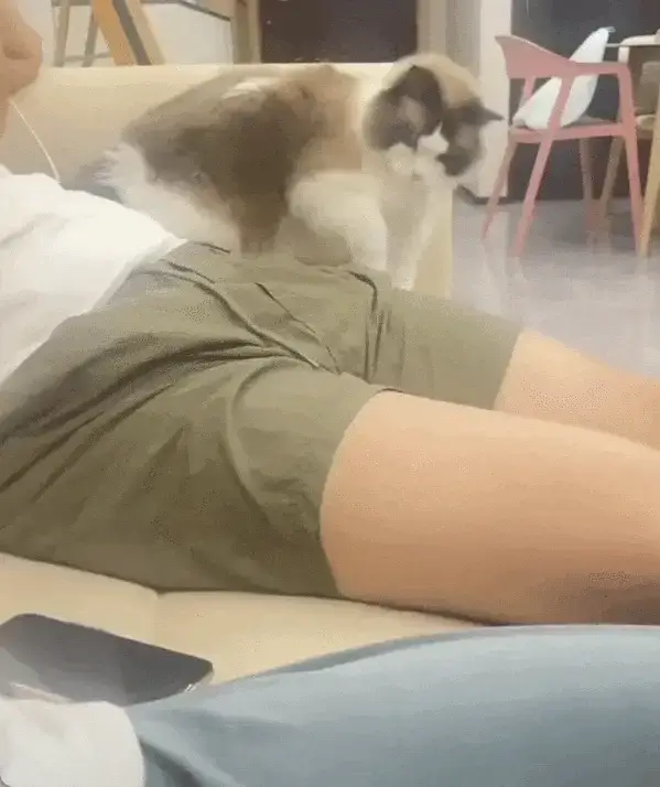고양이가 갑자기 힘을 불어넣어 앞발을 마치 '전동 모터'처럼 빠르게 움직이며 분홍빛 젤리 발바닥으로 남자친구의 허벅지를 맹렬하게 때리기 시작했습니다!