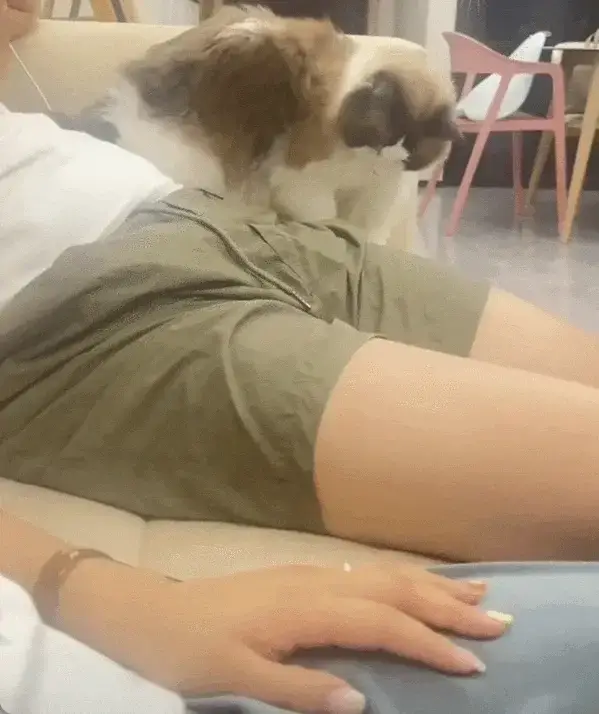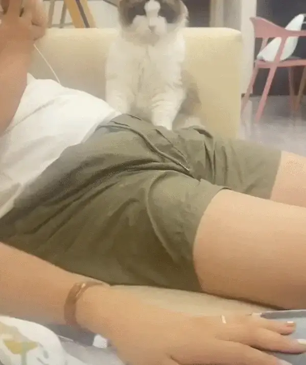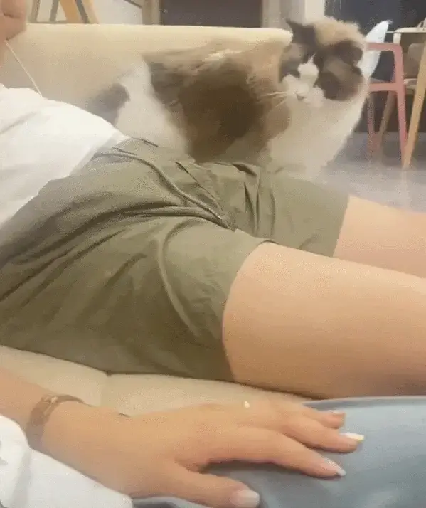 고양이가 갑자기 힘을 불어넣어 앞발을 마치 '전동 모터'처럼 빠르게 움직이며 분홍빛 젤리 발바닥으로 남자친구의 허벅지를 맹렬하게 때리기 시작했습니다!