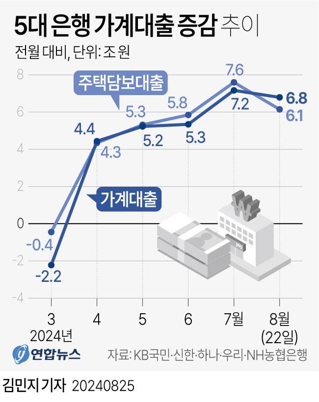 5대 은행(KB국민·신한·하나·우리·NH농협)의 지난 7월 말 주택담보대출(전세자금대출 포함) 잔액은 559조7천501억원으로, 6월 말(552조1천526억원)보다 7조5천975억원 늘었다. 월간 기준으로 역대 최대 증가폭이다.