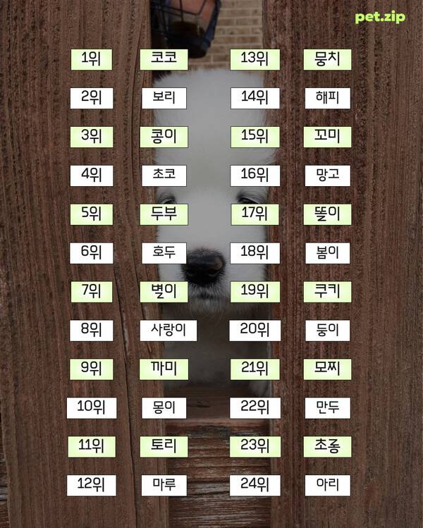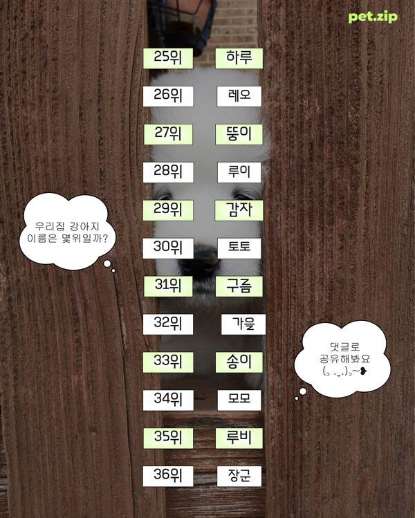‘루비·레오·하루·감자·구름’처럼 반려견의 성격 또는 느낌을 담은 이름들도 여전히 높은 선호도를 보였으며, 새로운 이름보다 오랫동안 사랑받아 온 이름들이 더 넓은 지지를 얻는 경향이 나타났습니다.