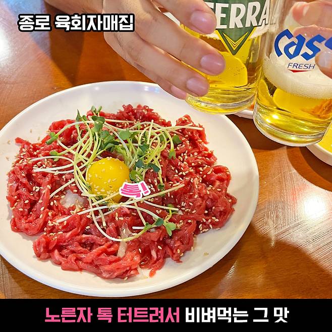 1965년 개업하여 광장시장에서만 60년을 지키며, 3대째 맛을 지키고 있는 터줏대감 육회 맛집이에요. 맛집의 비결은 바로 매일 아침마다 공급받는 신선한 국내산 소고기! 따라서 그 어느 집보다 고소함과 신선한 맛이 일품이에용.노른자 하나 톡 터트려 육회를 비벼 먹는 그 맛이란 bb