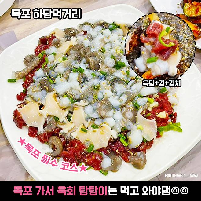 육회가 맛있다고 얼마나 맛있겠어~ 하실 수도 있지만 요긴 달라요. 두툼한 육회와 목포산 낙지 + JMT 반찬들 집어 넣고 김에 싸 드셔 보세요. 이래서 육탕이는 목포~목포 하는구나 고개 끄덕이게 되실거에요!