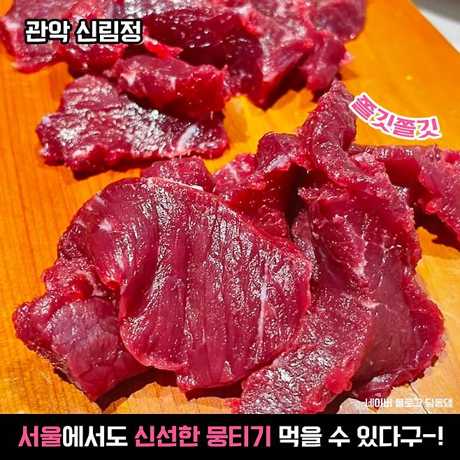 한우를 날 것으로 먹는 방법은 여러가지가 있죠? 육사시미, 육회, 뭉티기 등등! 언젠가부터 슬금슬금 대구 뭉티기가 나타나기 시작하더니 최근 성시경의 ‘먹을텐데’에 신림정이 나오며 유명세를 타기 시작했어요.