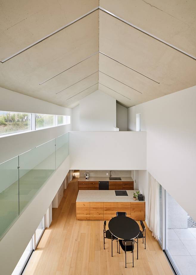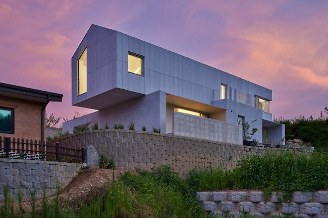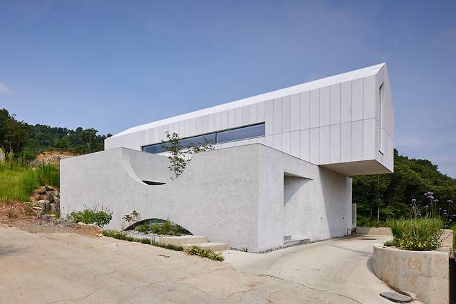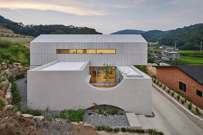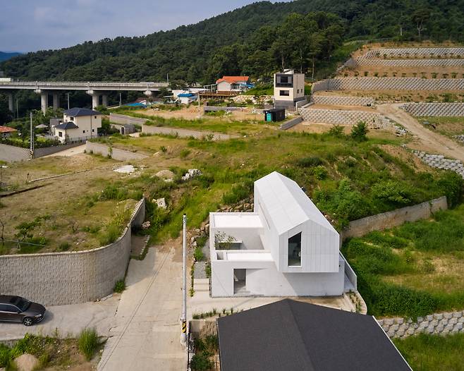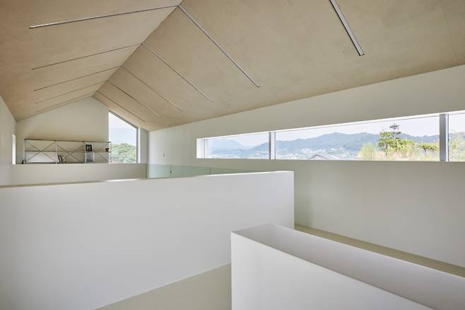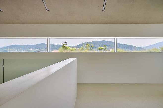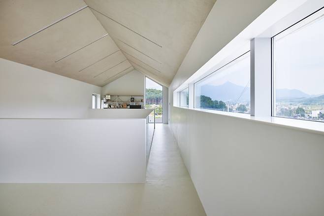 재택근무를 하는 부부를 위해 2층은 다리를 두어 주거공간과 작업공간을 분리했다. 다리는 삶과 일이 전이되는 공간으로 부부는 다리를 건너 일터로 향하는 동안 긴 수평의 창을 통해 연속되는 산자락을 감상할 수 있다.