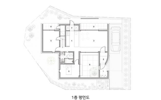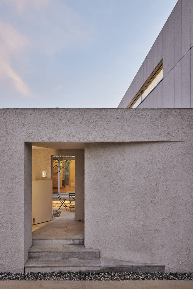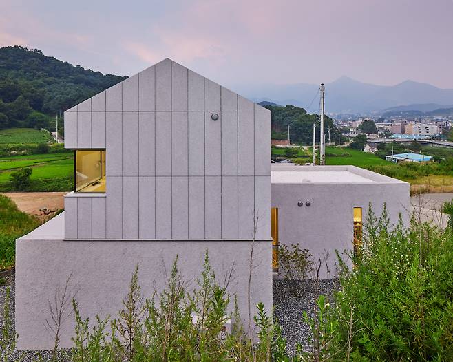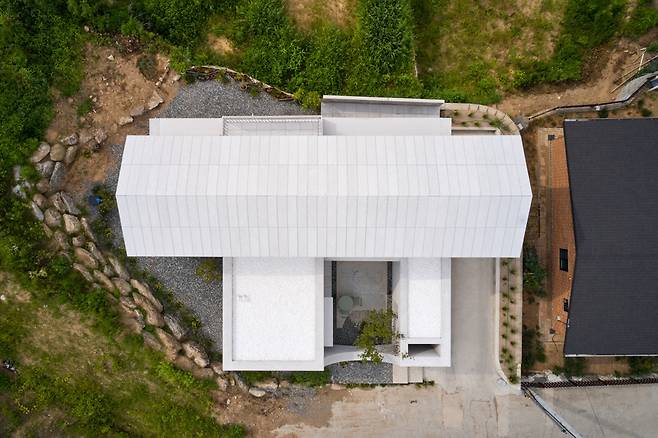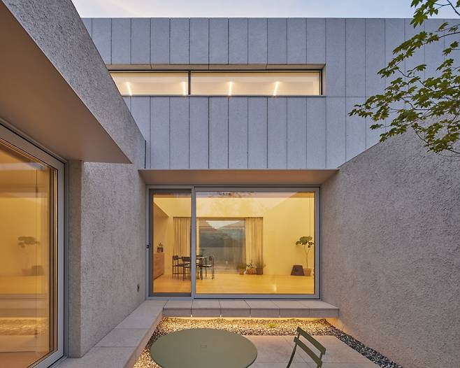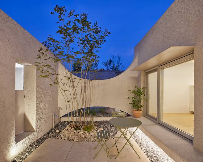 이 집에는 각기 다른 성격을 가진 두 개의 마당이 있다. 사면이 벽으로 둘러싸인 중정 형식의 남측 마당은 거친 마감의 벽을 배경으로 가까운 조경을 감상하는 내부 마당이고, 북측 마당은 먼 산을 바라보며 바깥 풍경과 바람을 느낄 수 있는 밖으로 열린 마당이다. 두 마당은 거실을 사이에 두고 연결되며, 거실을 관통하는 풍경의 통로는 바람과 빛이 지나는 길이 되기도 한다.