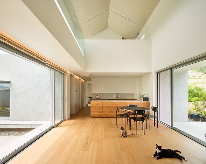 사람 눈높이의 담장은 일부를 낮추어 빛과 풍경을 받아들이고, 땅에 닿은 담장의 일부는 고양이들이 마당 밖 풍경을 볼 수 있도록 살짝 들어 열어주었다. 이는 가족들에게 다른 시선의 풍경을 더해주며, 열린 담장은 때에 따라 달라지는 그림자를 만들어 매일 새로운 풍경을 선사한다.