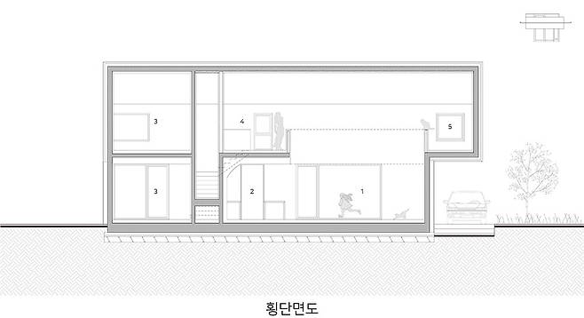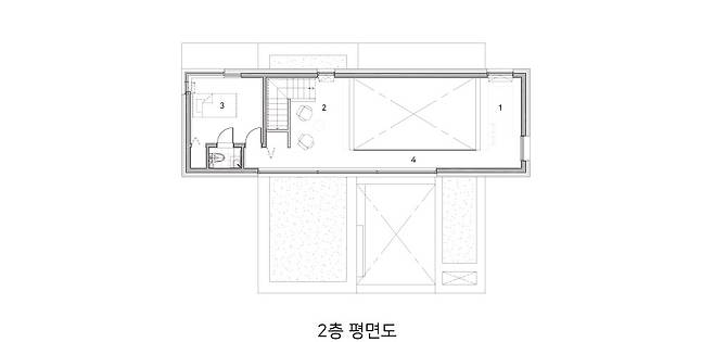 이 집은 비움으로써 채워지는 집이다. 집의 모든 공간은 비워진 하나의 큰 공간으로 연결된다. 2층의 긴 수평 창으로 들어오는 햇살은 유리 난간을 통해 1층 거실의 깊은 곳까지 따듯함을 전달하며, 1층 거실의 마주 보는 창을 통해 들어오는 바람은 2층 작업실까지 시원함을 전달한다.