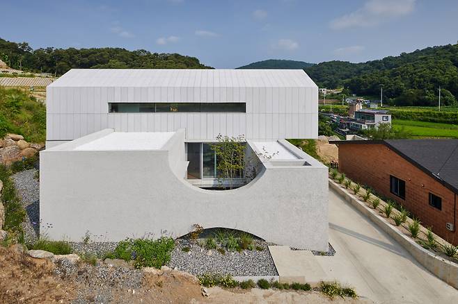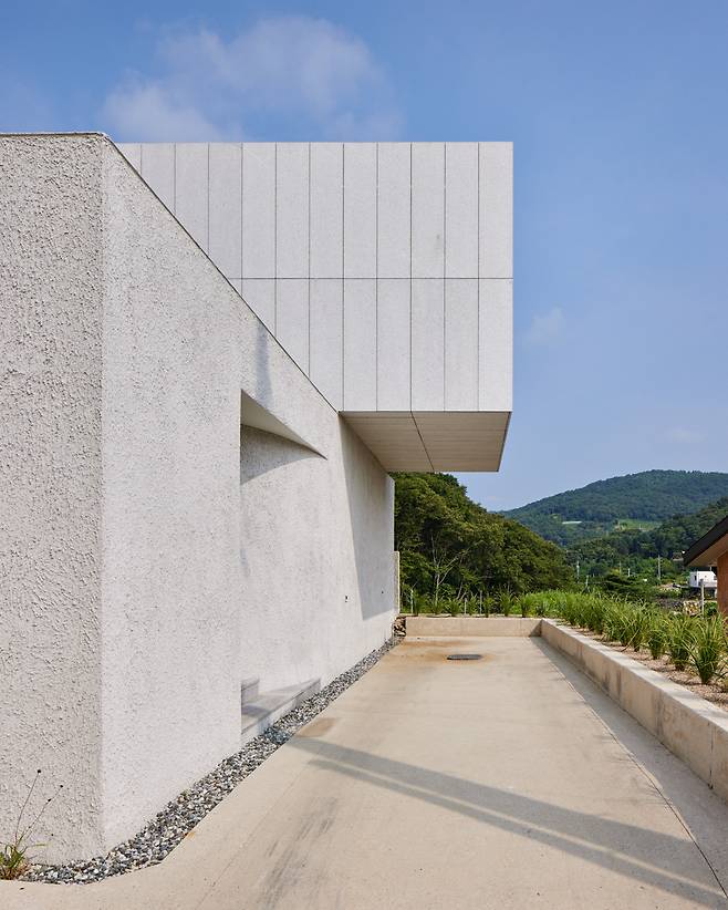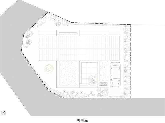 대지 남쪽은 마을로 진입하는 길에 면해 있어 오가는 사람들의 시선과 차량 불빛으로 인한 간섭이 예상되었다. 이에 집과 길 사이에 담장을 두어 한층 쾌적한 물리적 환경을 조성한 건축가.