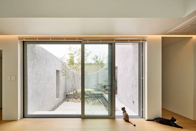 따라서 집과 길 사이에 담장을 두어 한층 쾌적한 물리적 환경을 조성했다. 마당에는 서로 다른 두 개의 시선이 공존하는데 사람 눈높이의 담장은 일부를 낮추어 빛과 풍경을 들이고, 땅에 닿은 담장의 일부는 고양이들이 마당 밖의 풍경을 볼 수 있도록 살짝 들어 열어주었다.