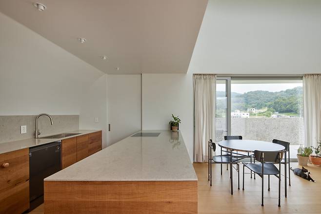 거실 창을 통해 들어오는 바람은 2층까지 시원함을 전달하며, 2층의 긴 수평창으로 들어오는 햇살은 1층 거실의 깊은 곳까지 따듯함을 전달한다. 넓게 비워진 거실은 아이들이 맘껏 뛰노는 놀이터가 되기도 하고, 가족들이 집안 곳곳에서 서로를 살피며 더 많은 대화를 나눌 수 있도록 돕는다.
