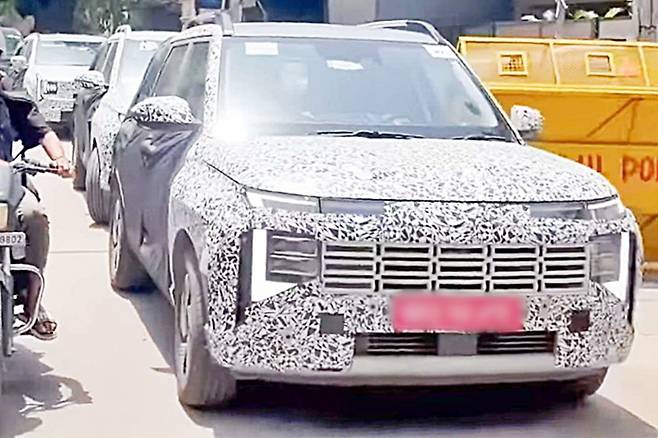 이번에 포착된 차세대 베뉴는 기존 모델 대비 확연히 달라진 전면부 디자인을 자랑한다. 특히 가장 먼저 눈에 띄는 변화는 새로운 쿼드 LED 헤드램프다. 이는 현대 크레타와 팰리세이드의 디자인을 혼합한 형태로, 기존의 분리형 헤드램프를 버리고 더욱 남성적인 디자인을 적용한 것으로 보인다.