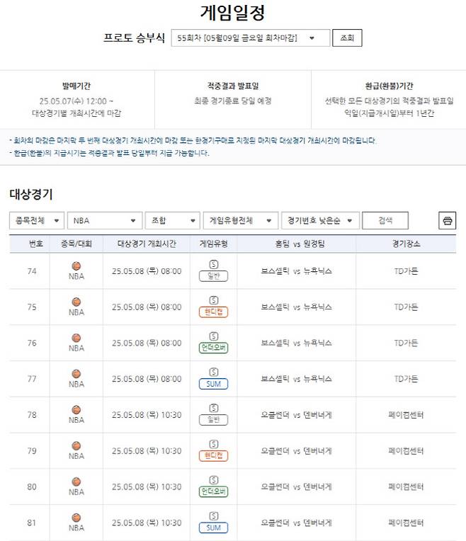 이번 프로토 승부식 55회차에서 2024-25시즌 NBA 플레이오프 2차전을 대상으로 하는 경기는 5월 8일에 열리는 보스턴셀틱스-뉴욕닉스(74~77번), 오클라호마시티썬더-덴버너게츠(78~81)전이다.