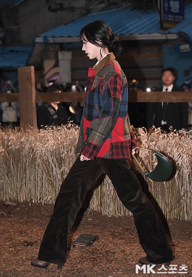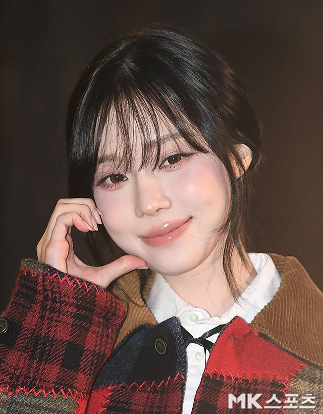 윈터는 자연스럽게 흐르듯 내려오는 시스루 뱅과 잔머리를 살린 로우 번 스타일은 얼굴 윤곽을 부드럽게 감싸며 특유의 청초한 분위기를 배가시켰습니다.
