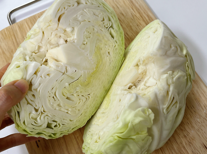 양배추를 반을 잘라 보관하는 경우에도 심지 부분을 도려냅니다.