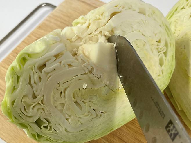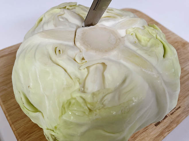 양배추 보관 시 가장 중요한 부분, 바로 양배추 심지입니다. 양배추는 심지부터 검게 변하면서 상태가 안 좋아집니다. 그렇게 때문에 심지를 제거하는 것이 중요한데요.