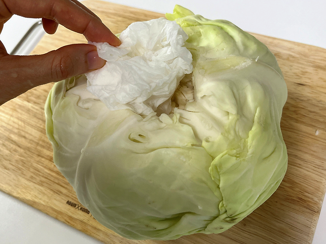 키친타월에 물을 적신 후 동그랗게 뭉쳐주세요. 그런 다음 양배추 중앙 구멍 난 곳에 쏙 넣어줍니다.