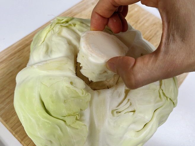 양배추 가운데에 있는 심지를 칼로 도려낸 후 손으로 잡아서 빼주세요. 심지는 남는 부분이 없도록 깨끗하게 도려내는 것이 좋습니다.