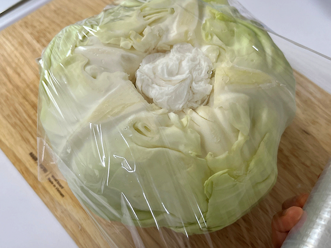 키친타월을 넣은 후 랩으로 꼼꼼하게 감싸서 냉장보관하면 끝입니다. 심지 도려내기와 젖은 키친 타월 넣어주기만 하면 양배추, 오랫동안 싱싱하게 드실 수 있습니다.