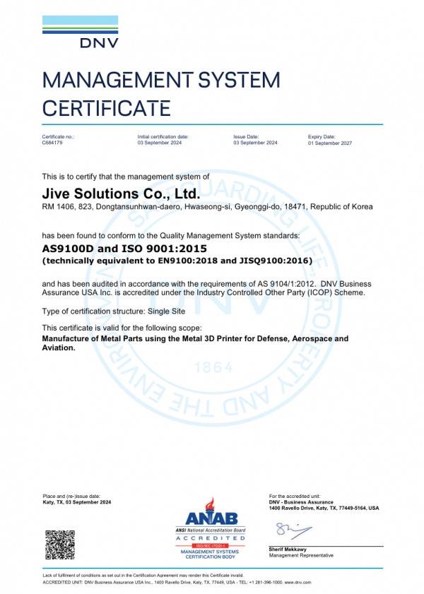 AS9100D 인증은 자이브솔루션즈의 3D프린팅 및 적층 가공 공정이 국제적 수준의 품질 요건을 충족함을 의미한다. 국내에서 AS9100D 인증을 받은 적층 가공업체가 존재하지만, 자이브솔루션즈는 적층 가공 특화 열처리 공정에 대한 인증을 받은 국내 유일의 기업으로서 독보적인 위치를 확보하고 있다.