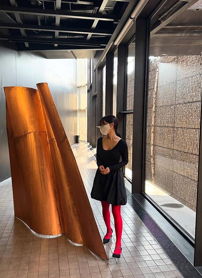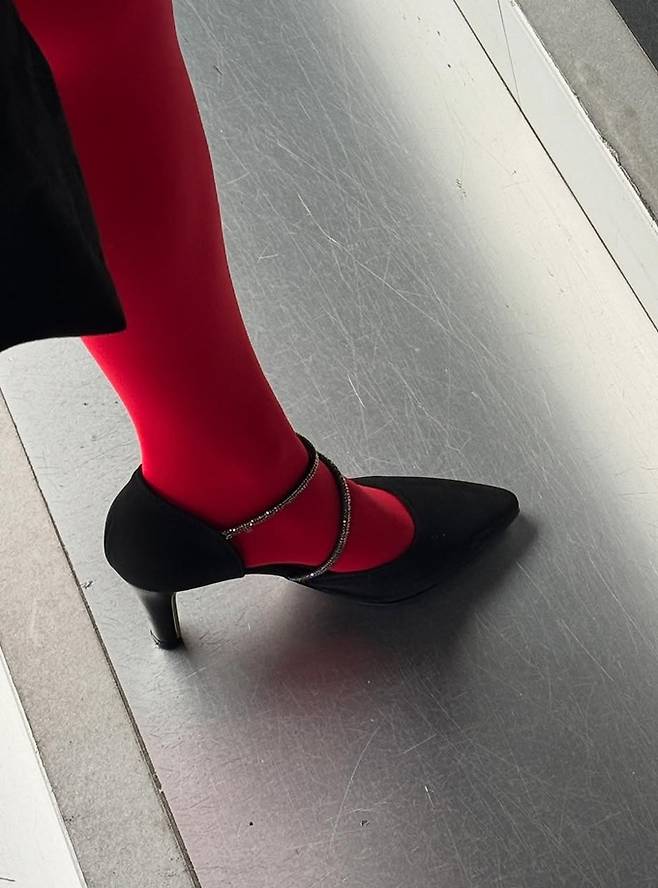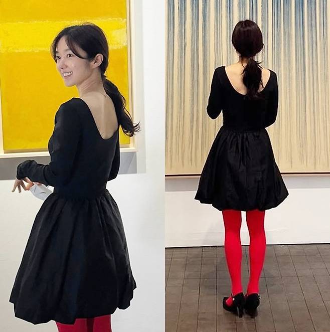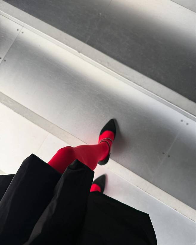공개한 사진에서 이혜성은 눈에 확 띄는 빨간 스타킹에 등과 가슴이 파인 블랙 톱과 블랙 벌룬 미니 스커트를 입고 러블리하면서도 우아한 공주룩을 선보였다.