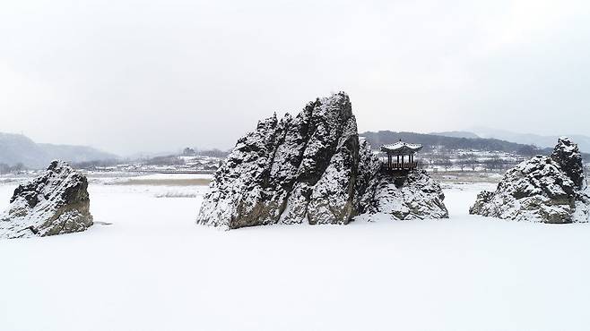 가장 큰 봉우리 위에 자리한 정자 ‘삼도정’은 본래 1766년 단양군수 조정세가 ‘능영정’으로 건립한 것을 시작으로, 여러 차례 재건을 거쳐 현재는 콘크리트 구조로 세워졌다. 목조건축은 아니지만, 정자가 주는 고요한 균형감은 설경과 절묘하게 어우러진다.