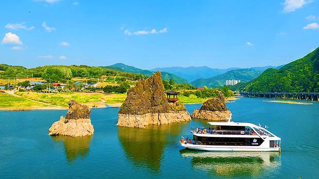 도담삼봉이라는 이름은 ‘섬 도(嶋)’, 깊을 담(潭)’을 지닌 도담마을에서 비롯되었다. 한때 배를 타야만 접근 가능했던 마을 앞 세 개의 바위 봉우리는, 지금은 계절마다 다른 모습으로 여행자에게 잊지 못할 인상을 남긴다.