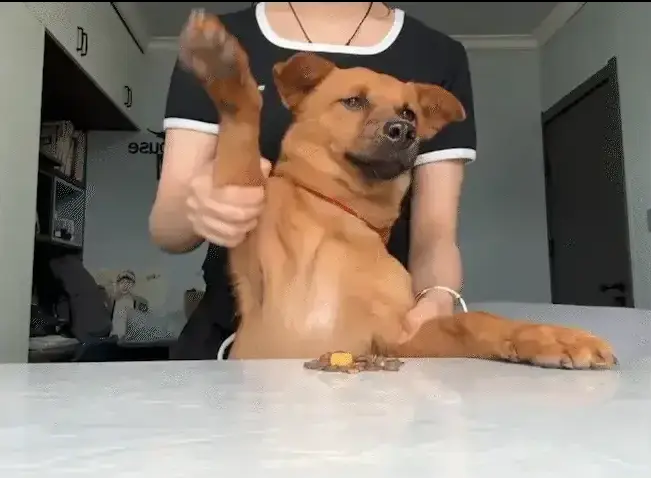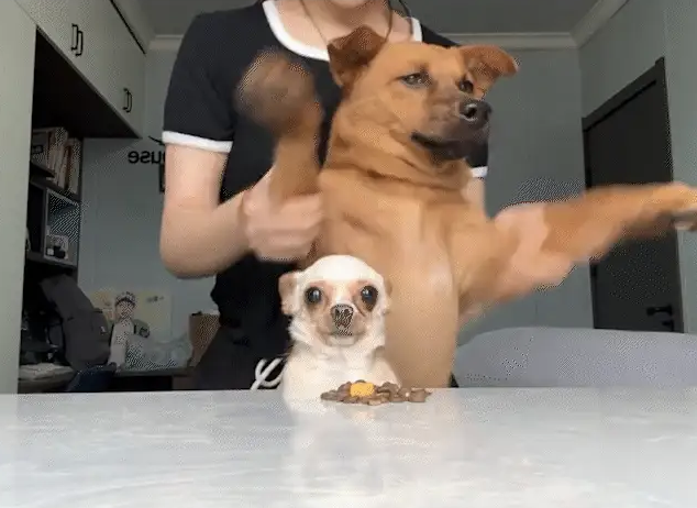 집 안의 또 다른 작은 강아지가 갑자기 테이블 밑에서 고개를 내밀더니 큰 강아지 앞에 딱 나타난 것이죠. 그 바람에 간식은 날아가고, 불운한 작은 강아지까지 큰 강아지 발에 채여 멀리 떨어졌습니다!