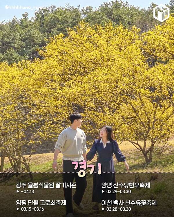 양평은 단월 고로쇠축제와 산수유한우축제가 3월 개최를 앞두고 있으며, 이천 산수유꽃축제는 수도권에서 가장 큰 규모의 산수유꽃군락에서 열려 가까운 곳에서도 충분히 샛노란 산수유꽃의 향연을 만나볼 수 있습니다. 축제기간 이천 특산물도 맛볼 수 있어 눈과 입이 모두 즐거운 3월 축제로 추천합니다.