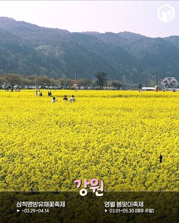 2025 삼척 유채꽃축제는 3월 29일부터 4월 14일까지 개최를 앞두고 있습니다. 끝없이 펼쳐진 들판 위, 노란 유채꽃이 만발한 풍경이 펼쳐질 예정인데요. 뒤로는 웅장한 산맥과 벚꽃이 흐드러져 봄기운을 한껏 만끽하기 좋습니다.