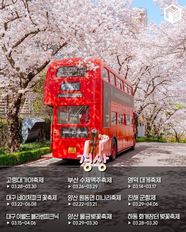 2025년 전국에서 3월 축제가 가장 많이 열리는 경상도입니다. 전통문화 축제부터 향기로운 봄꽃축제, 든든한 미식축제까지 다양한 종류의 축제가 3월 한달 내내 펼쳐지죠.