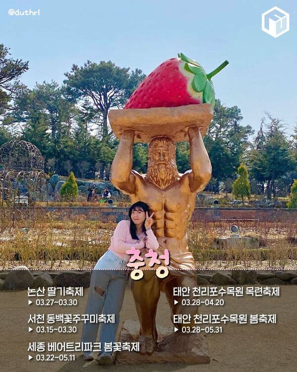 충청 3월 축제는 먹거리 축제와 봄꽃축제가 다양하게 펼쳐집니다. 최근 SNS에서 큰 주목을 받고 있는 논산 딸기축제는 3월 27일부터 3월 30일까지 열리는데요. 축제 기간 딸기를 테마로 한 이색적인 체험과 볼거리 프로그램이 다양하게 마련되며, 달콤한 딸기를 보다 저렴하게 구매할 수도 있습니다.