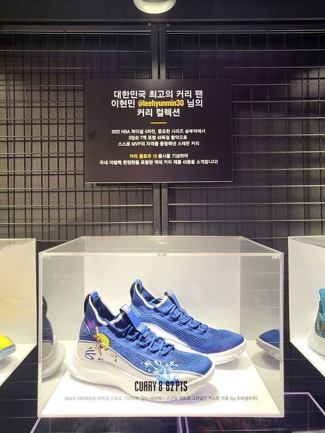 맞아요. 사실 농구화 자체가 표면이 꺼끌꺼끌하고 판이 늘어나는 재질이라 그림을 그리거나 커스텀 제작하기가 어려울 거라 생각했어요. 그런데 어느 날, 농구화를 전문적으로 수집하고 있는 이현민 고객님께서 스테픈 커리의 열렬한 팬인데 지난 해 커리가 한 경기 최다득점인 62점을 달성했을 때, 이를 기념하고자 커리 농구화 커스텀 제작 요청을 하셨어요. 그런데 농구화는 굉장히 손이 많이 가는 작업인데다 커스텀 제작 경험도 없는지라 사실 처음에는 어려울 것 같다고 말씀드렸는데, 고객님께서 어려움 감수하고 하겠다며 한번 해보자라고 하셔서 작업을 진행하게 됐어요. 그런데 예상 외로 작품의 완성도가 너무 잘 나온거에요. 그 분께서도 작품을 정말 마음에 들어 하셨고요. 농구화의 오돌도돌한 부분을 최대한 평평하게 만드는 데 포커싱을 맞췄고 자연스럽게 디자인을 표현할 수 있었던 것 같아요.