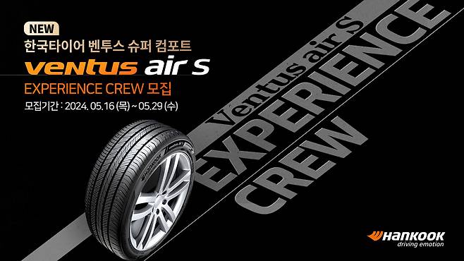 한국타이어앤테크놀로지(한국타이어)는 이달 29일까지 프리미엄 컴포트 타이어 신상품 '벤투스 에어 S'를 체험할 '익스피리언스 크루' 30명을 모집한다고 17일 밝혔다