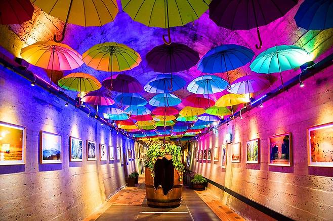 김해 와인동굴은 국내에서 최초로 친환경 유기농 산딸기 인증을 받은 농장에서 직접 운영하는 명소입니다. 입구가 독특하게도 열차 카페와 연결되어 있어 흥미로운 볼거리를 제공합니다.