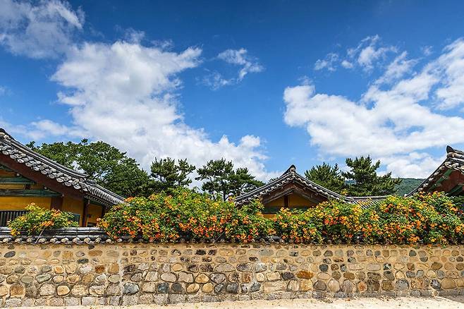 가야의 숨결을 품은 김해수로왕릉은 여름철이 되면 돌담을 따라 주황빛 능소화가 만개해 한옥과 어우러져 고즈넉한 풍광을 자랑합니다.