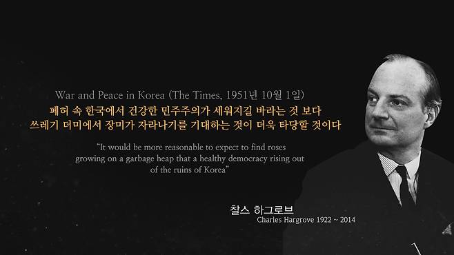 찰스 하그로브 기자는 1951년 '한국에서 민주주의를 바란다는 것보다 쓰레기 더미에서 장미를 기대하는 편이 좋다'는 기사를 쓰며 한국에 대한 애정을 드러내기도 했습니다.