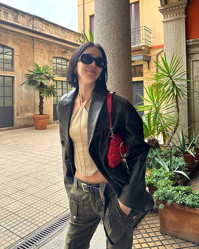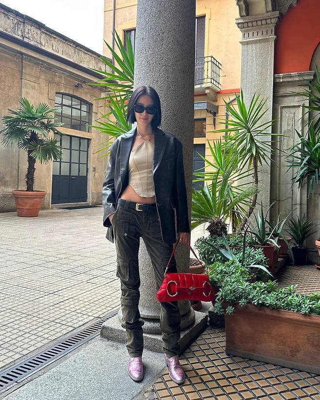 가죽 재킷에 카고 바지까지, 도도한 락시크 룩에 포인트가 되어준 레드백!