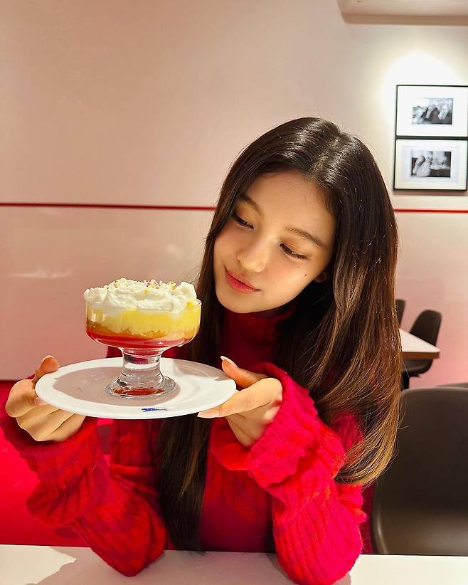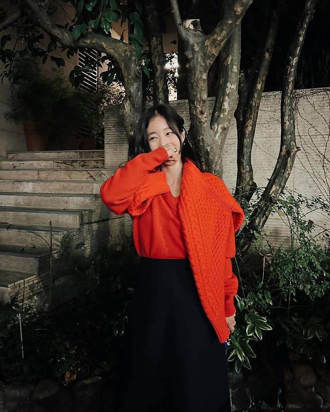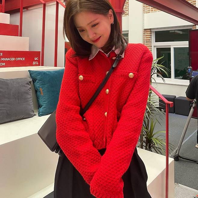 시선을 사로잡는 것은 바로 포근한 레드 스웨터✨