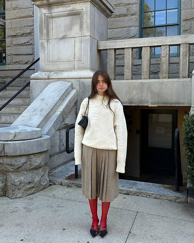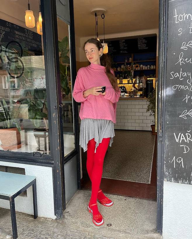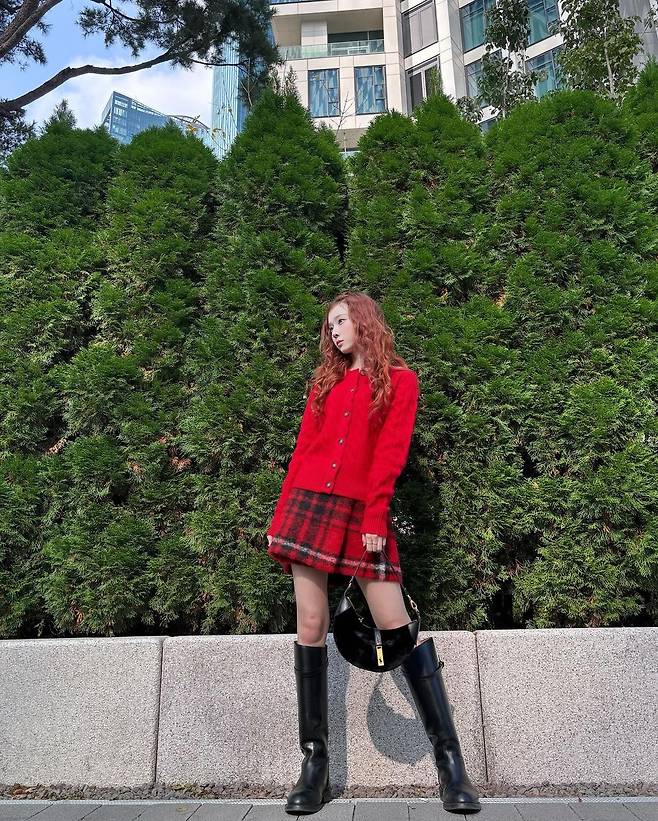 터틀넥 니트부터 스커트, 스타킹까지 레드로 맞췄지만