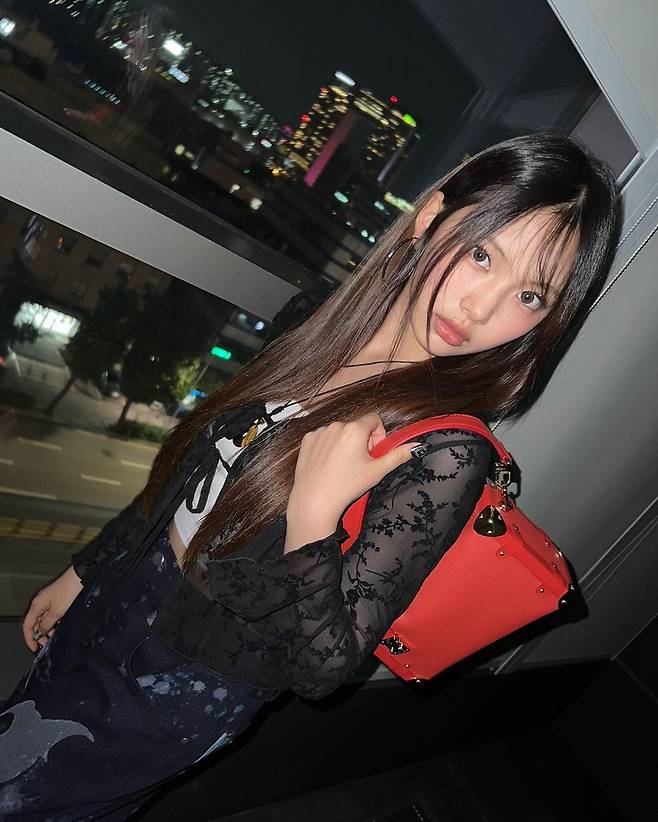 뉴진스 혜인은 상/하의 모두 어두운 컬러를 입어주고