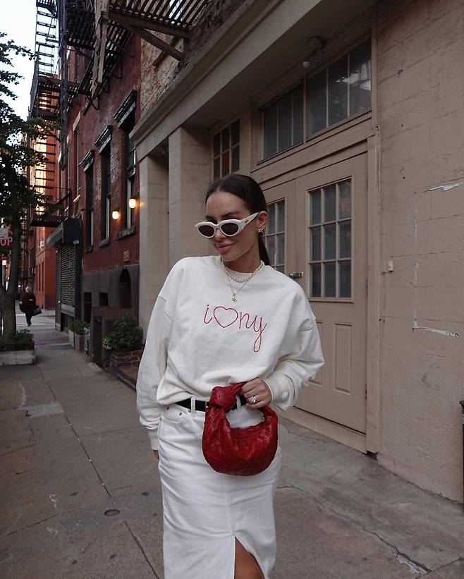 화이트 룩에도 깜찍하게 잘 어울려서 도전해보기 좋은 코디예요.