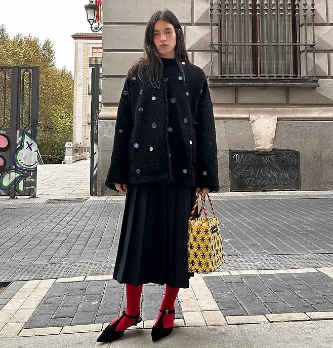 어두운 룩이든 밝은 룩이든 레드 스타킹 하나면 센스만점 코디가 된답니다~