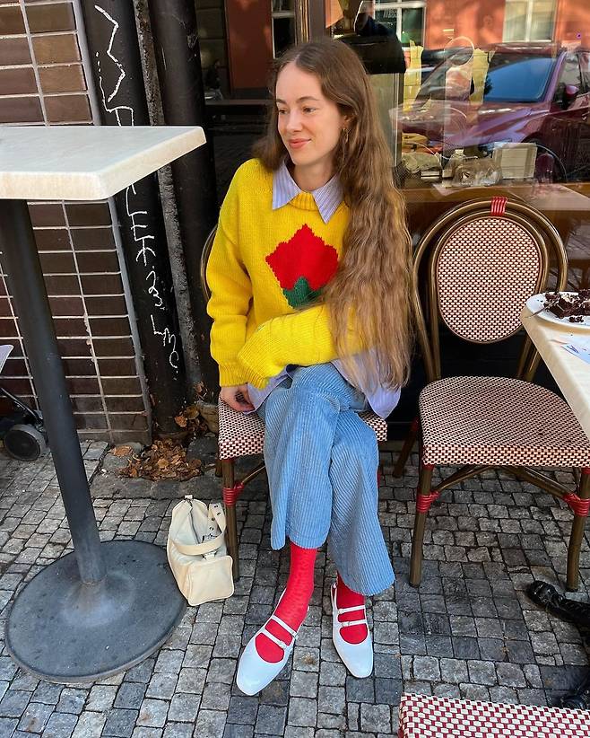 마리에는 컬러풀한 조합에 레드 스타킹을 신어줬어요!