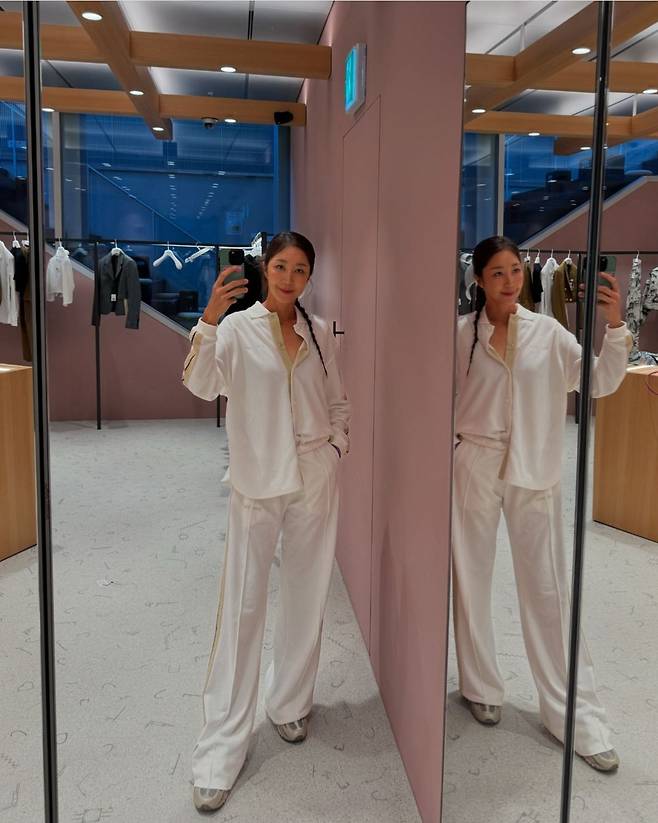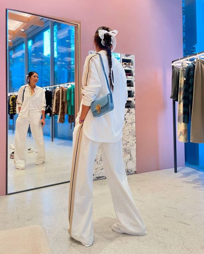 전미라는 사이드 배색 스트라이프 포인트가 더해진 셔츠와 팬츠를 셋업으로 착용해 힙하고 스타일리시한 패션을 선보였습니다.